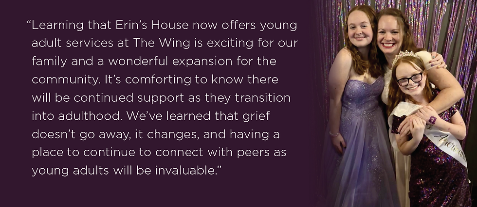 Over the years, I’ve seen the impact Erin’s House has had on my daughters in ways that resonate deeply with our whole family. As my daughter grows older and encounters new milestones like graduation, college, and a future career there will be moments when grief resurfaces. The tools we learned from our time at Erin's House gives me comfort knowing they will be able to communicate and connect with others. Those small lessons have turned our grief into gratitude, reminding us our love doesn't end just because someone is no longer physically here.